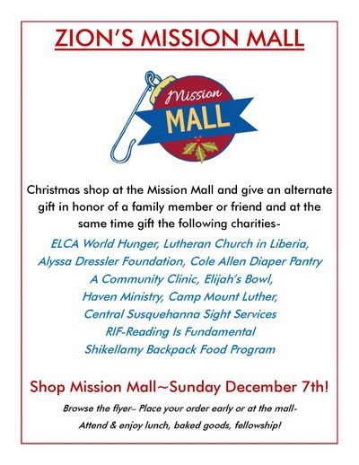 The Mission Mall is an annual ministry event held by Zion Lutheran Church. This Mission Mall takes place at the beginning of each Advent season and is designed as a special event where various non-profit organizations have the opportunity to present their missions and needs. The event enables church members and the community to support these nonprofits through donations or by participating in programs, effectively creating a marketplace of mission outreach efforts.